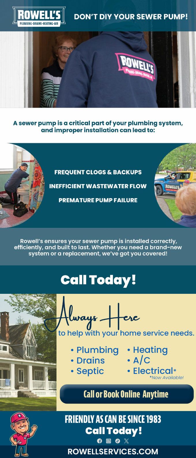 "Friendly As Can Be Since 1983!" When you need help with your plumbing, drains, heating, cooling or electrical in New Hampshire, you can always rely on Rowell's Services! Call us now or book online!